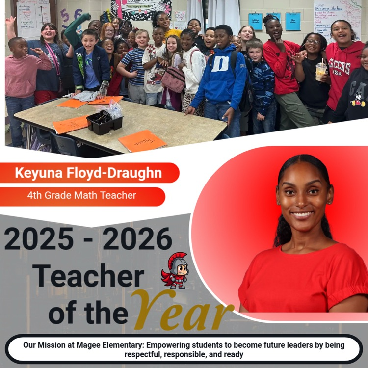 Magee Elementary proudly recognizes Keyuna Floyd-Draughn as OUR Teacher of the Year. With 12 years of dedicated service—all at Magee Elementary—Keyuna brings passion and excellence to the classroom as a 4th grade math teacher. Keyuna holds a Master of Education and is currently pursuing a Specialist in Educational Leadership. A previous 2017–2018 Teacher of the Year and MAE Innovative Educator Award recipient, Keyuna continues to model professionalism and innovation in education. Keyuna is also a devoted spouse and parent of four children, balancing family and career with unwavering commitment to our school community.
