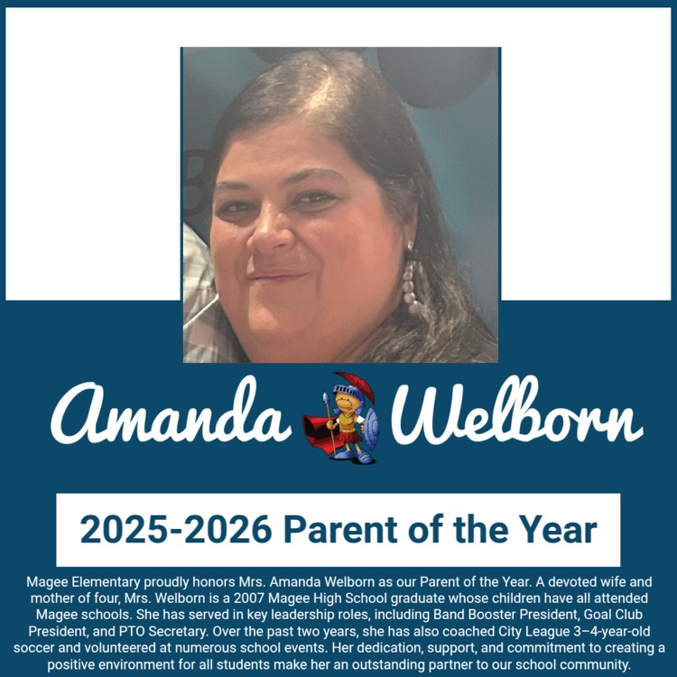 Magee Elementary proudly honors Mrs. Amanda Welborn as OUR Parent of the Year. A devoted wife and mother of four, Mrs. Welborn is a 2007 Magee High School graduate whose children have all attended Magee schools. She has served in key leadership roles, including Band Booster President, Goal Club President, and PTO Secretary. Over the past two years, she has also coached City League 3–4-year-old soccer and volunteered at numerous school events. Her dedication, support, and commitment to creating a positive environment for all students make her an outstanding partner to our school community.