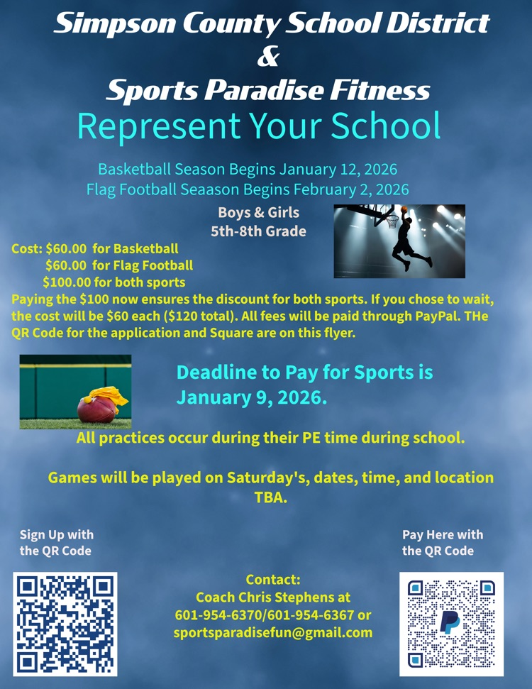 Simpson County School District, in partnership with Sports Paradise Fitness, is excited to offer Basketball and Flag Football for boys and girls in 5th Grade. Please review the flyer.